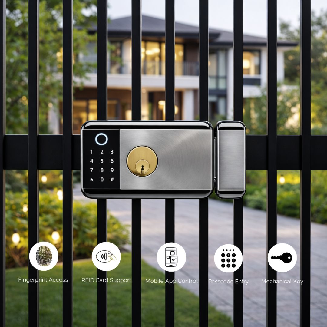 Locklyst Smart Metal & Double Door Lock is a heavy-duty smart locking solution designed for metal doors and double-leaf gates. Featuring fingerprint access, passcode entry, RFID card unlocking, mobile app control, and a mechanical key backup, it delivers powerful security for larger entrances.